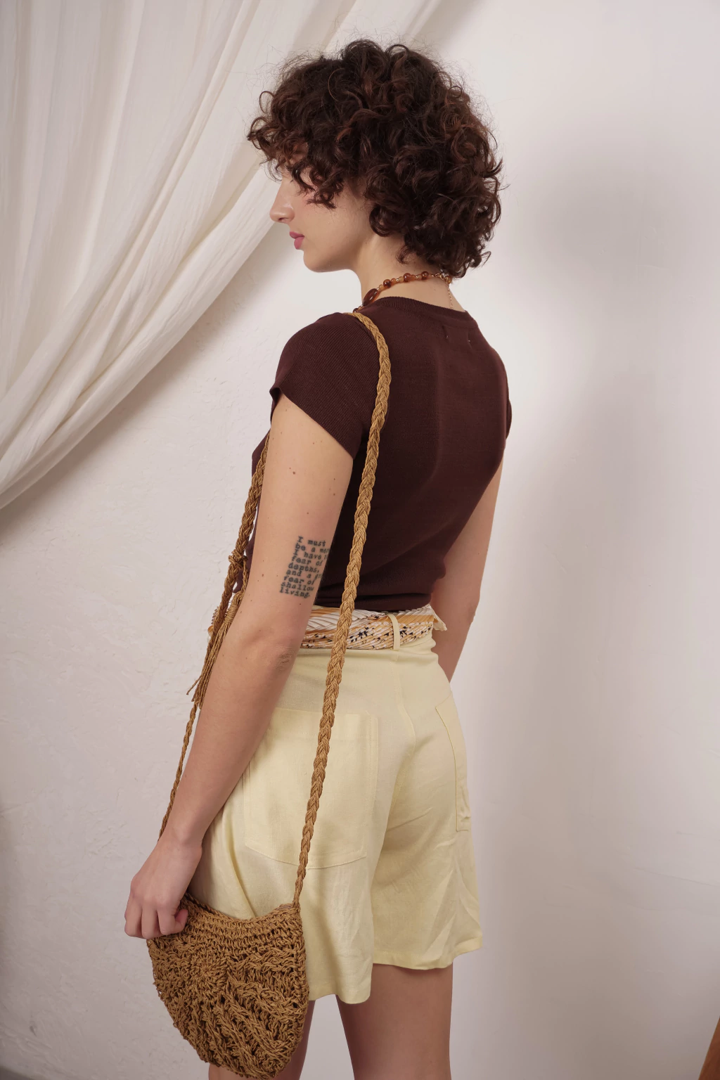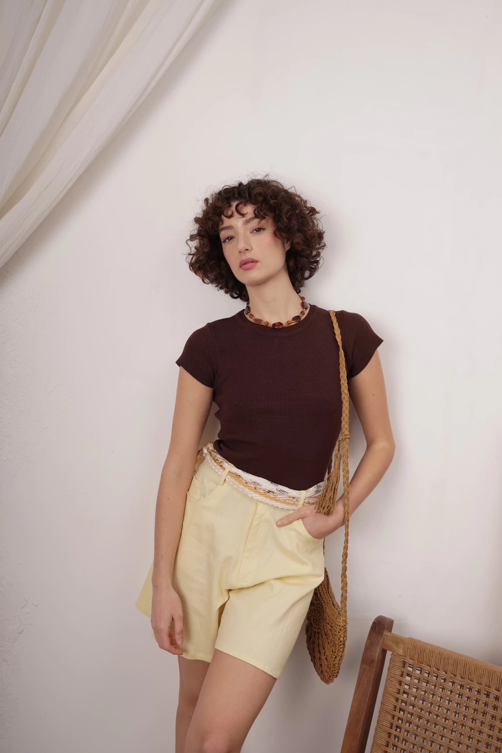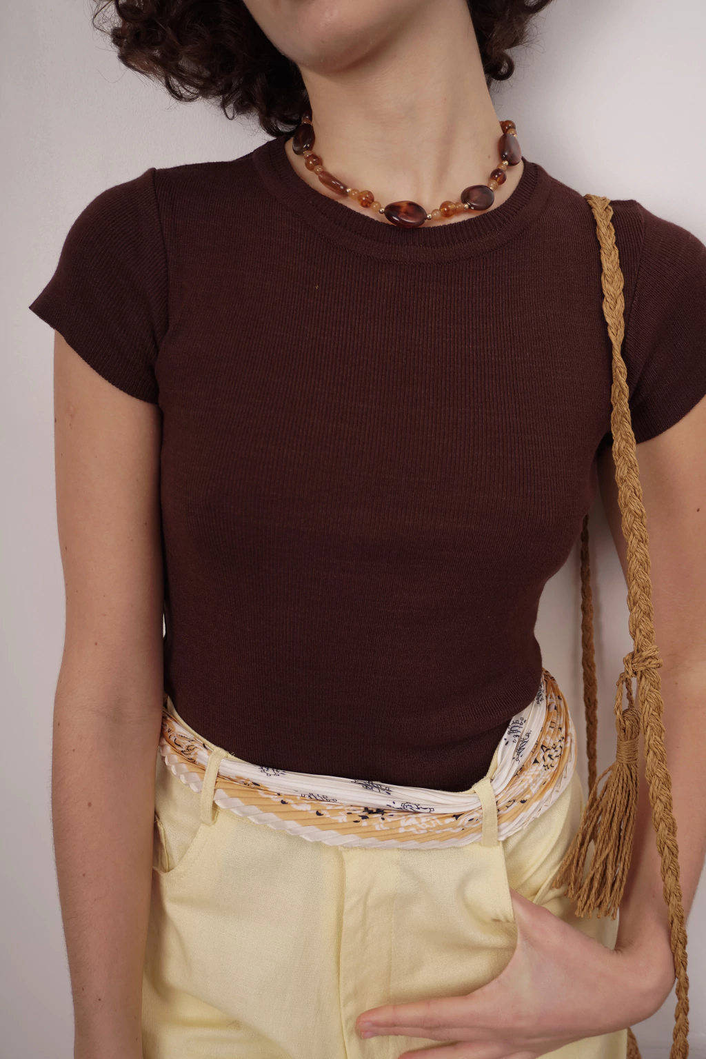 Remera tejida en hilado de viscosa, de manga corta y cuello redondo.
